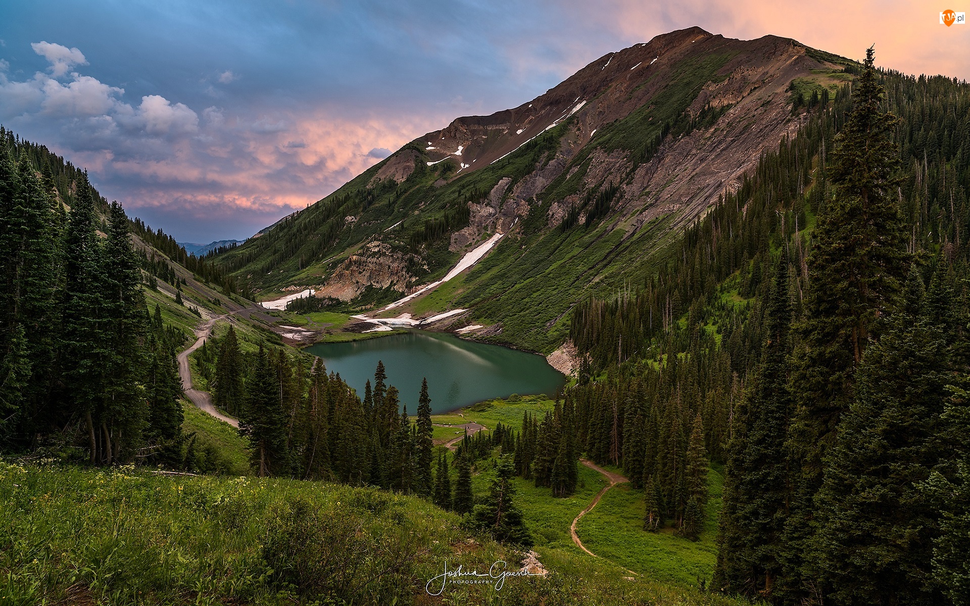 Elk Mountains, Świerki, Hrabstwo Delta, Las, Emerald Lake, Stan Kolorado, Przełęcz, Schofield Pass, Ścieżki, Drzewa, Jezioro, Stany Zjednoczone, Góry, Zachód słońca