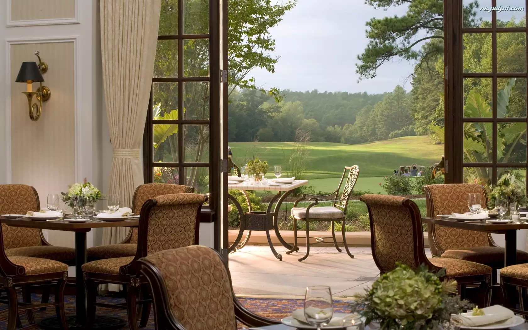 Widok, Stoliki, Zastawy, Krzesła, Drzwi