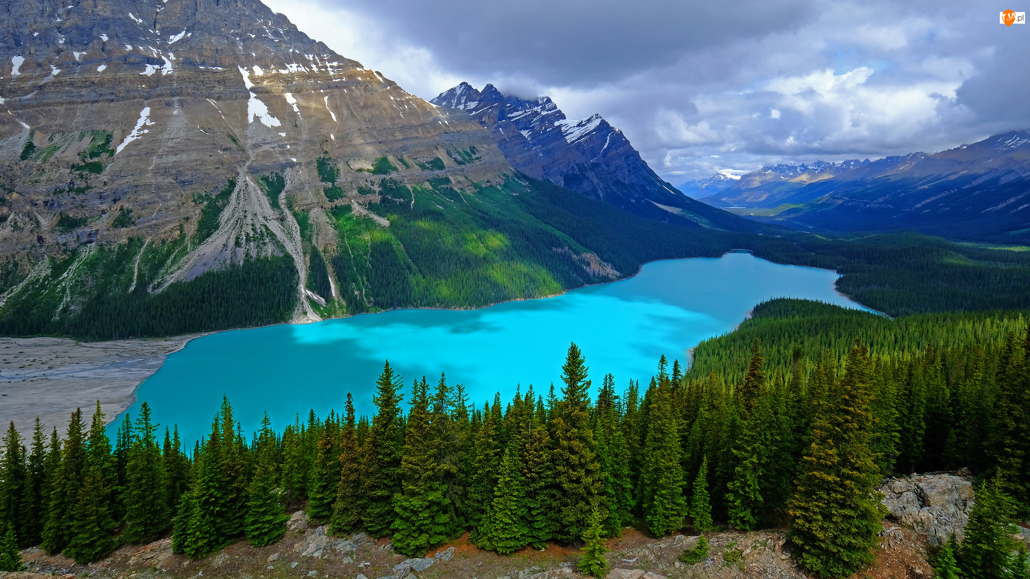 Kanada, Góry, Chmury, Skały, Jezioro, Park Narodowy Banff, Drzewa, Peyto Lake, Lasy, Prowincja Alberta