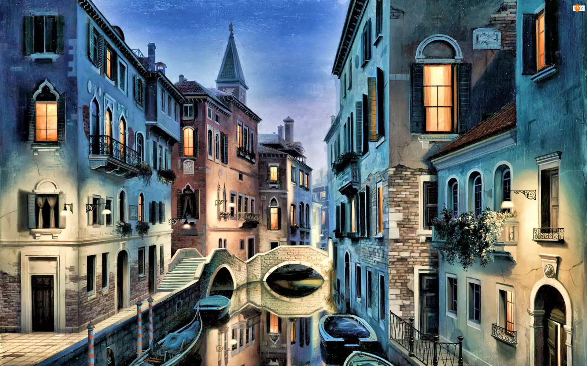 Wieczór, Wenecja, Kanał, Domy, Gondole