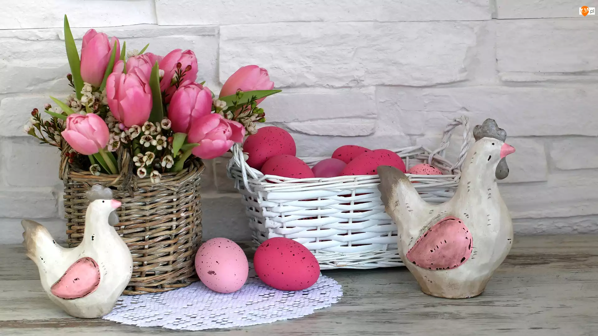 Kury, Wazon, Figurki, Pisanki, Serweta, Bukiet, Tulipany, Wielkanoc, Koszyk