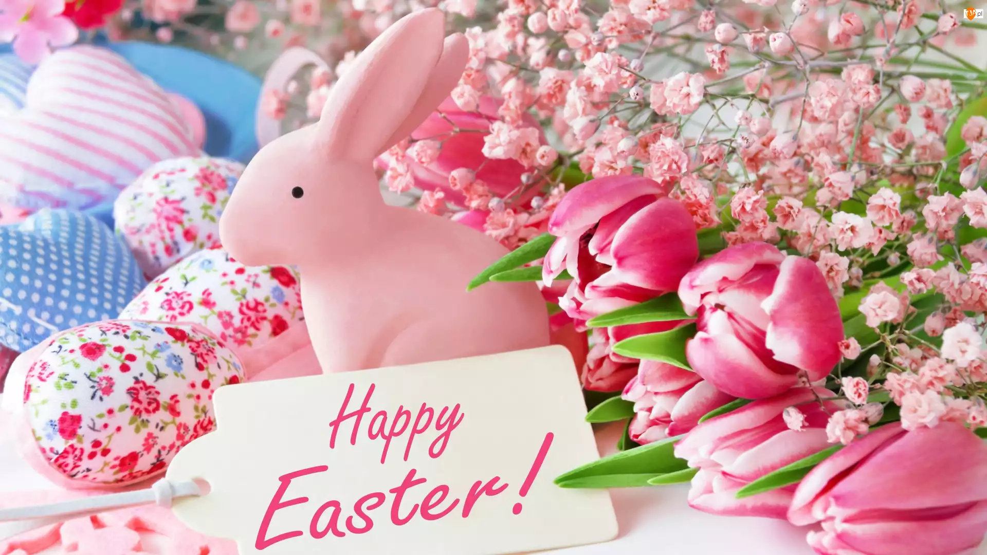 Życzenia, Figurka, Kartka, Królik, Pisanki, Wielkanoc, Tulipany, Kwiaty, Różowy, Napis