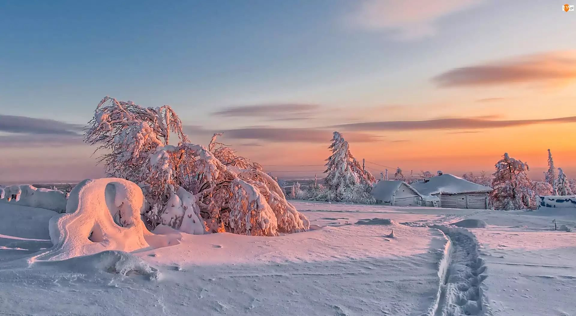 Wieś, Ośnieżone, Domy, Drzewa, Ścieżka