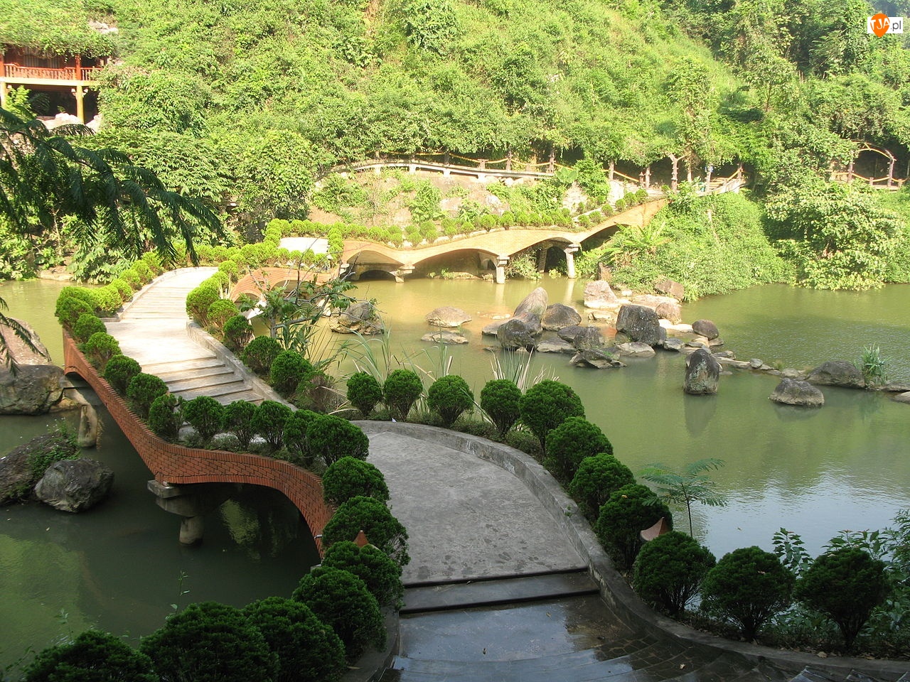 Drzewa, Wietnam, Mostek, Park, Woda