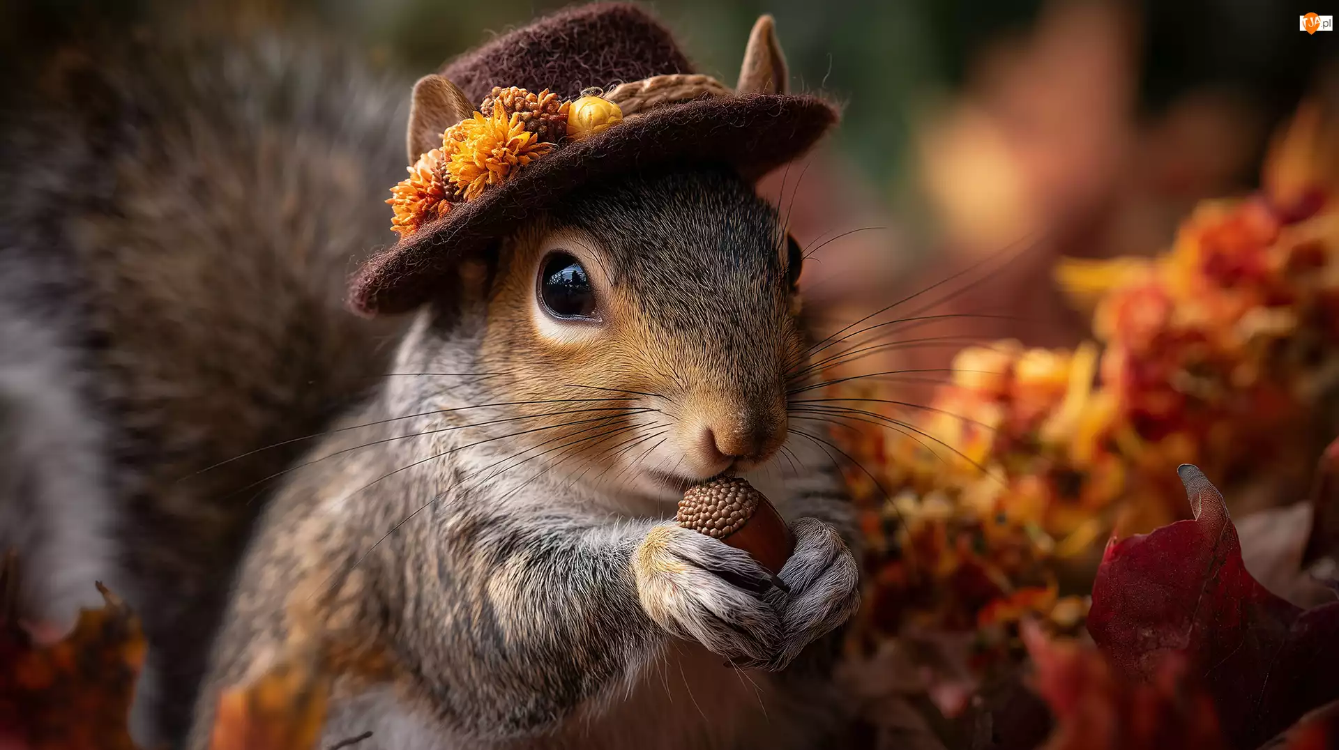 Wiewiórka w kapeluszu z żołędziem w łapkach