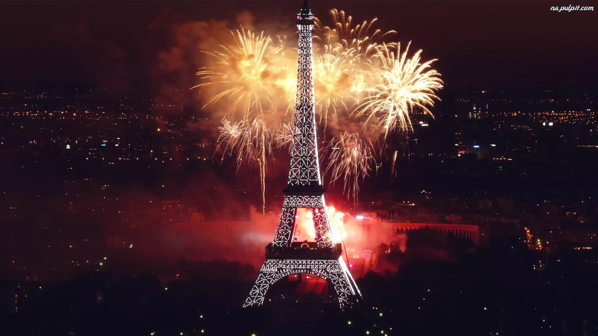 Wieża Eiffla, Fajerwerki, Paryż, Noc
