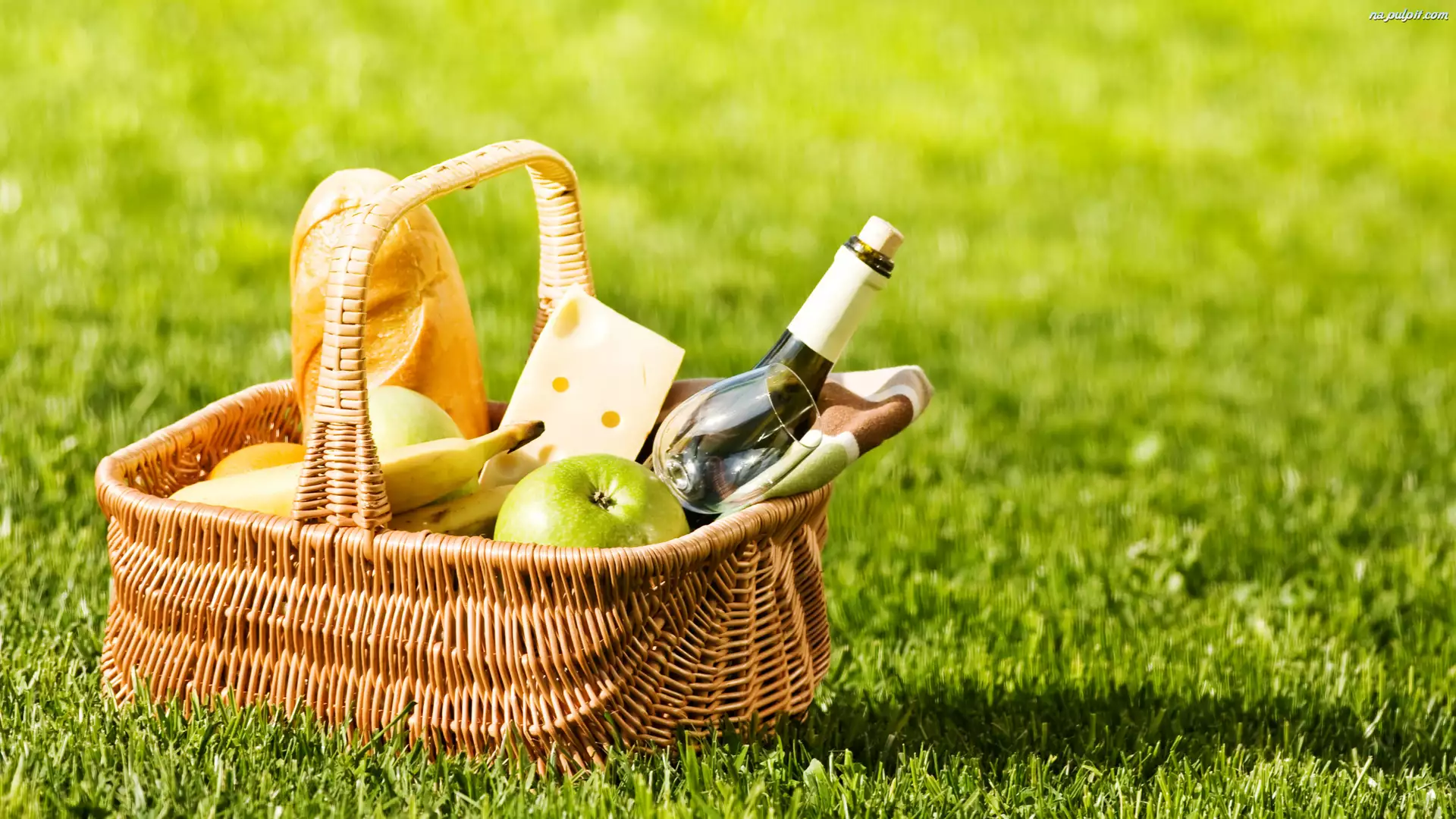 Wiklinowy, Koszyk, Pieczywo, Piknik, Banan, Wino, Jabłko