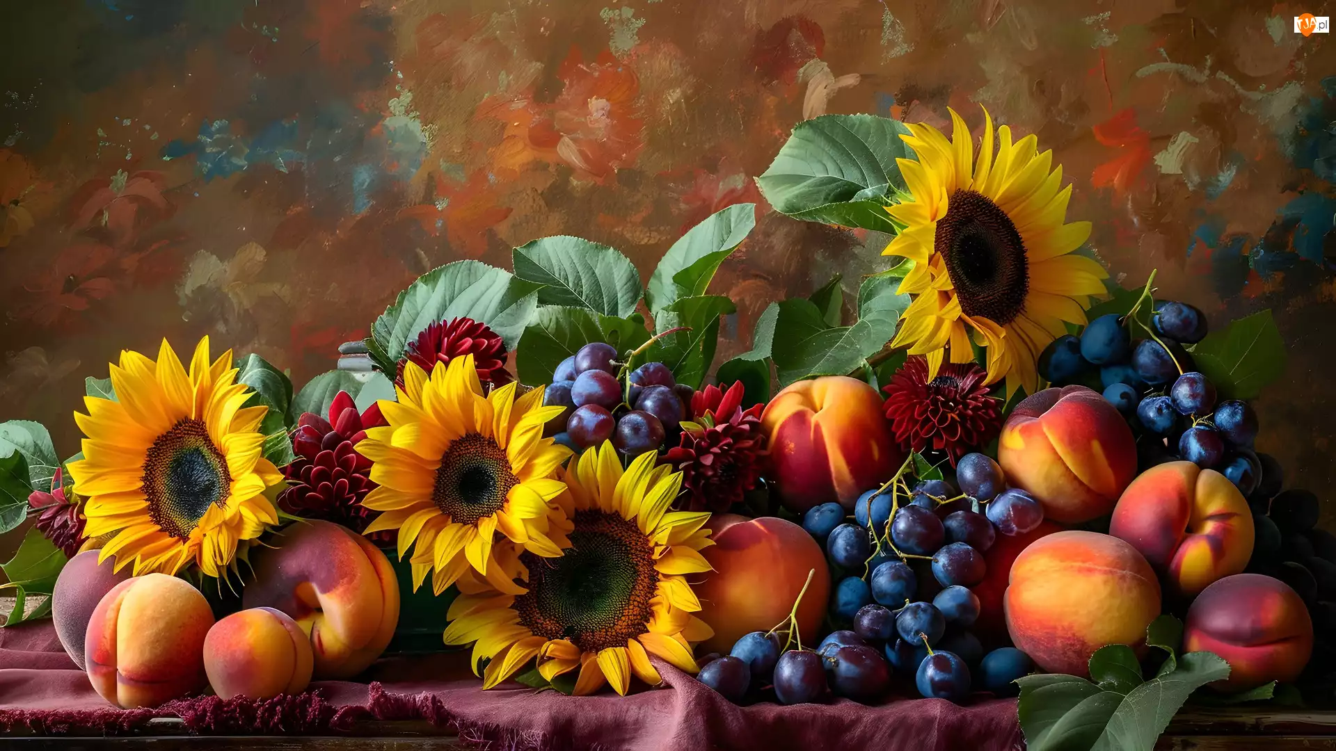 Winogrona, Kwiaty, Owoce, Stół, Słoneczniki, Brzoskwinie, Grafika, Dalie