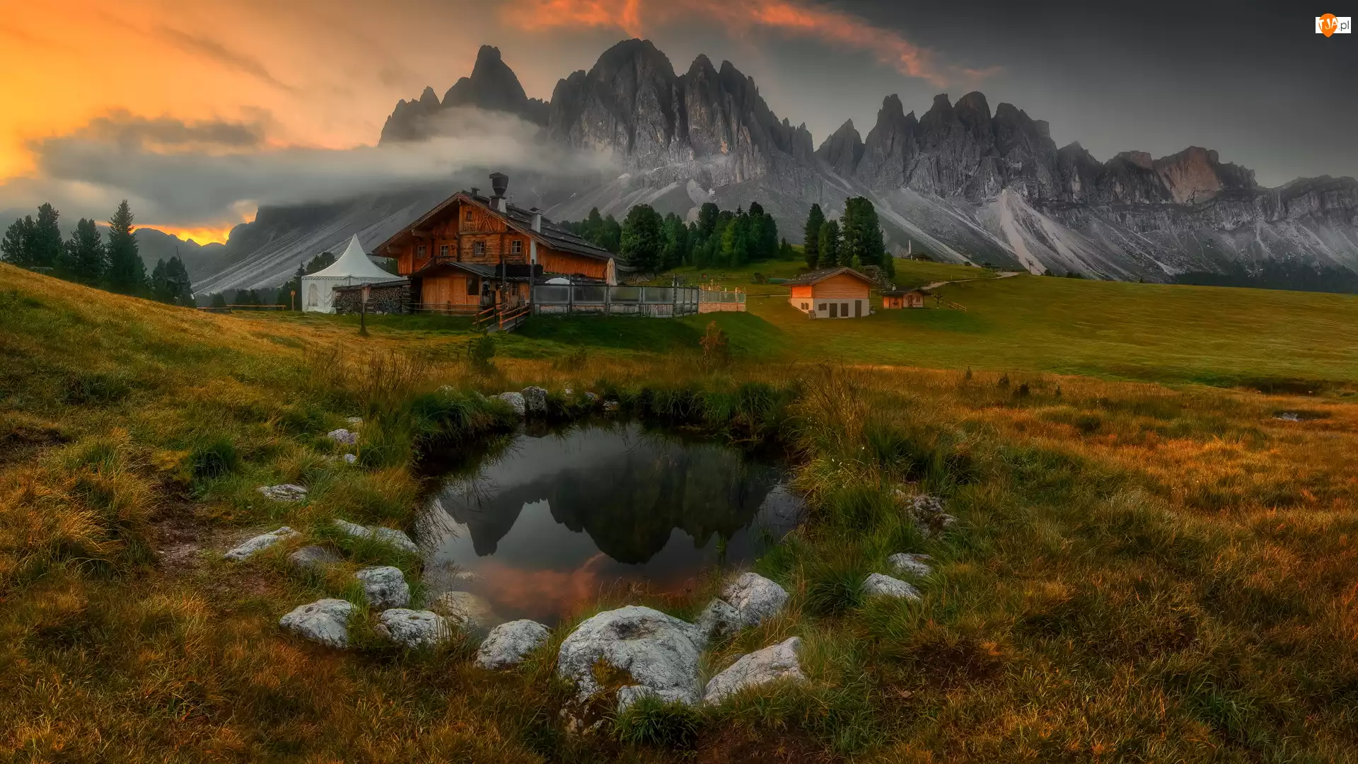 Włochy, Dolomity, Drzewa, Oczko wodne, Chmury, Park krajobrazowy Puez Odle, Góry, Góry, Domy
