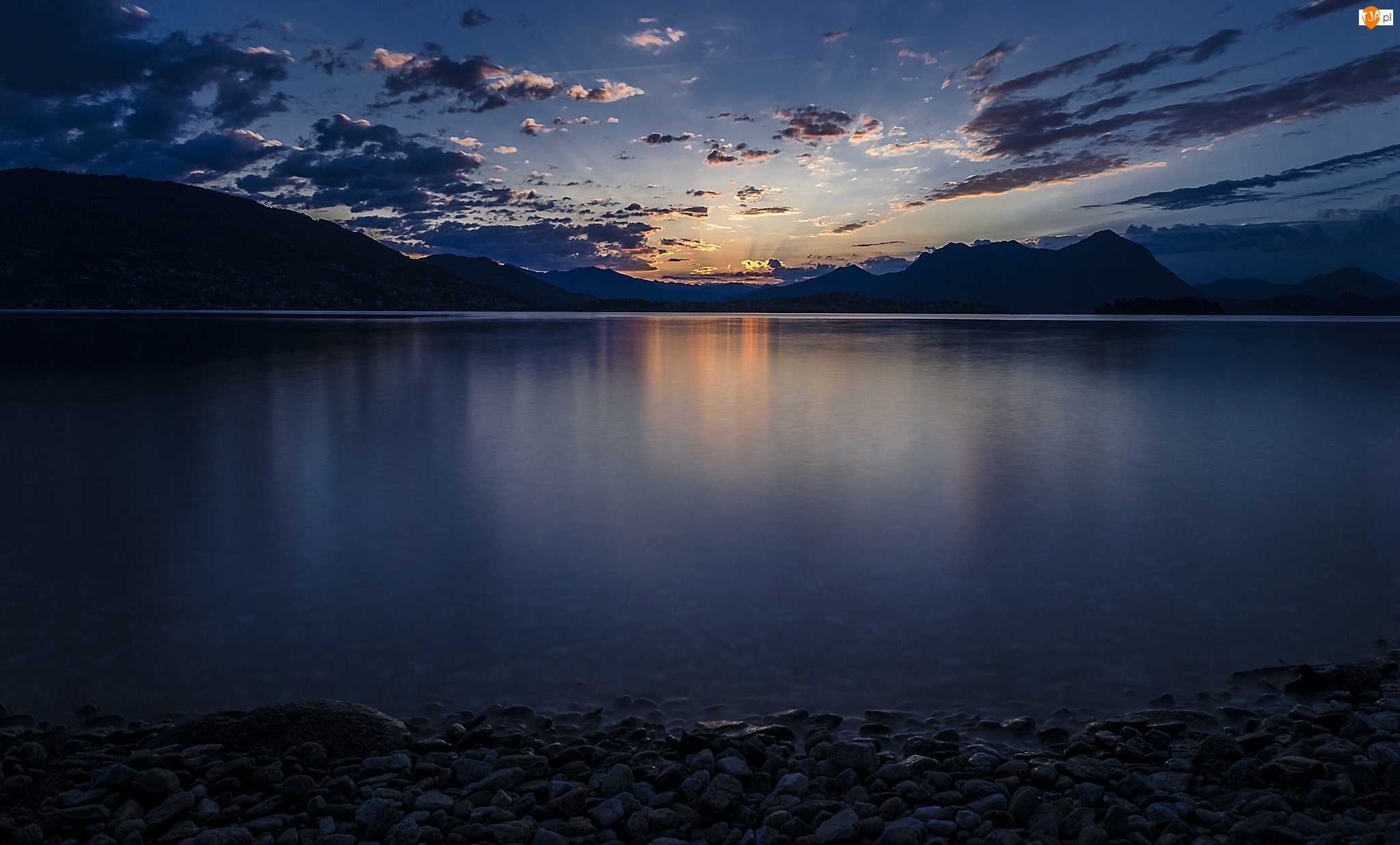 Zachód Słońca, Drzewa, Góry, Jezioro