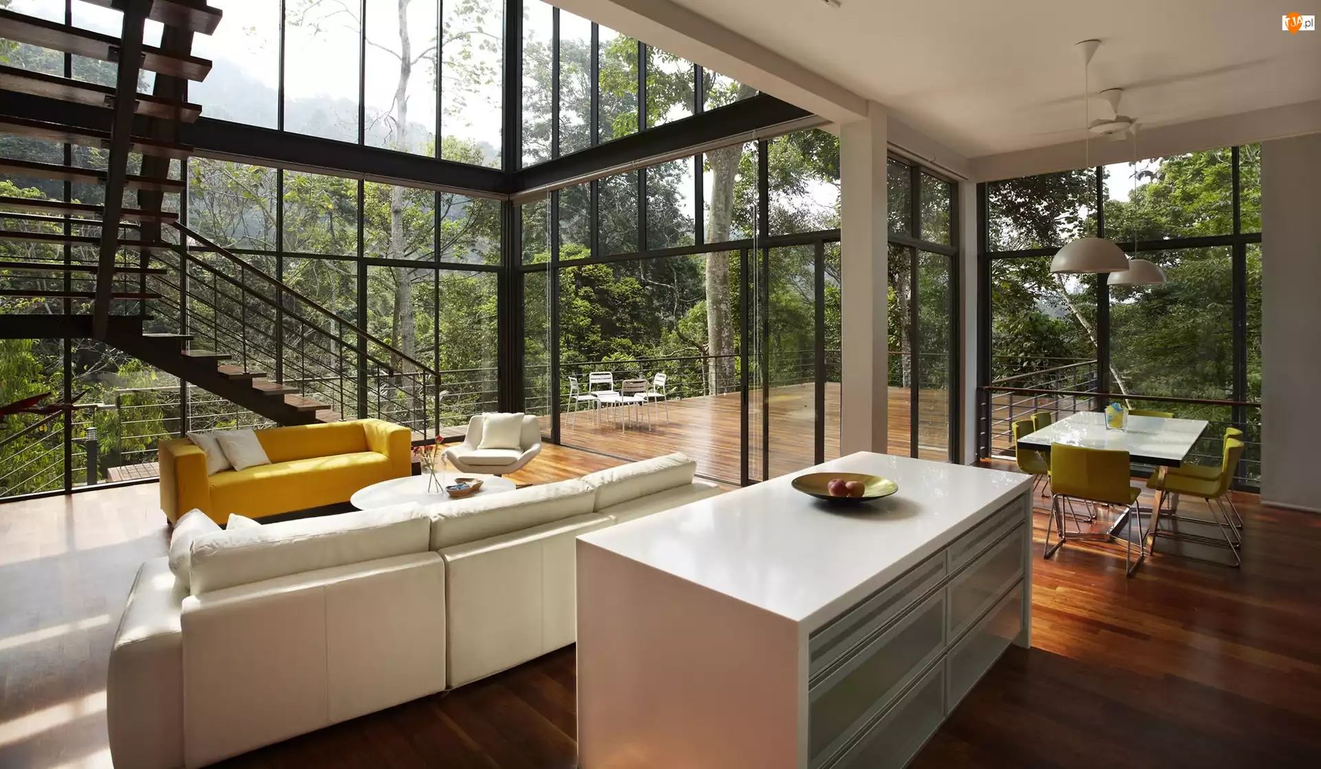 Wnętrze, Salon, Drzewa, Dom, Okna, Widokowe, Schody