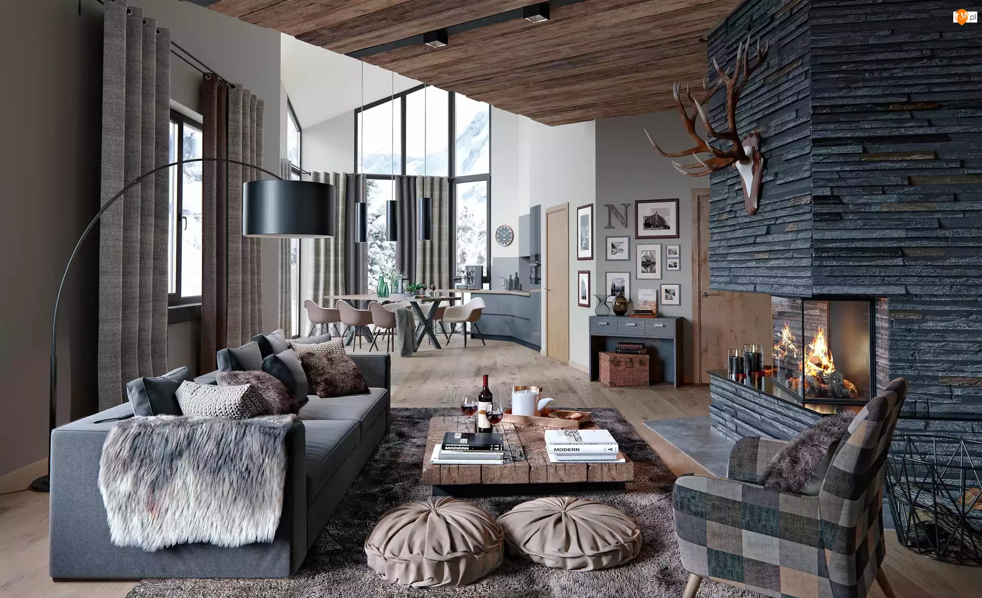 Kominek, Fotel, Stolik, Salon, Niski, Lampa, Kanapa