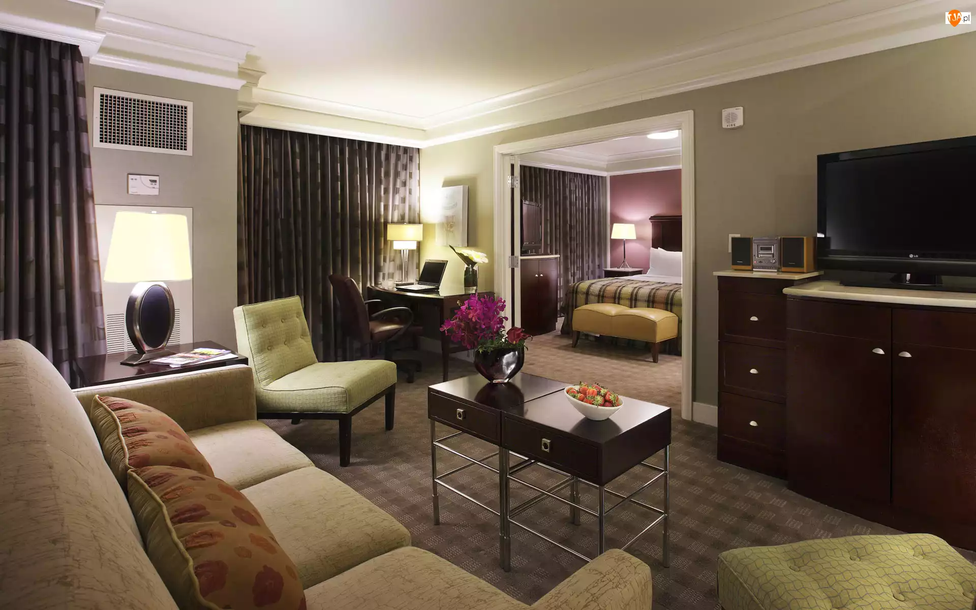 Wnętrze umeblowanego salonu z widokiem na sypialn