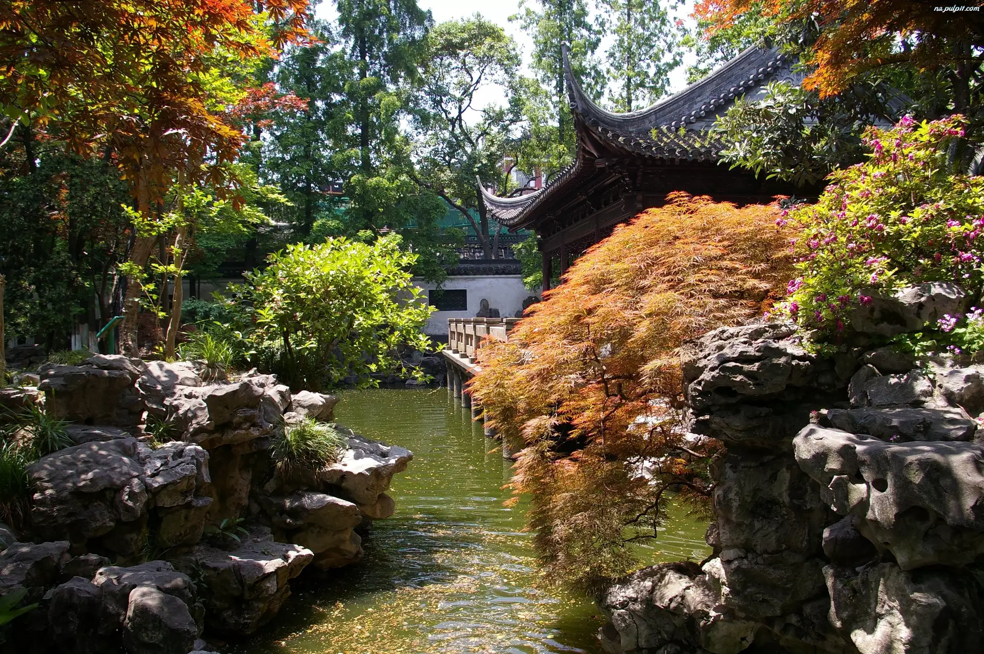 Kamienie, Ogród, Drzewa, Chiny, Woda, Szanghai