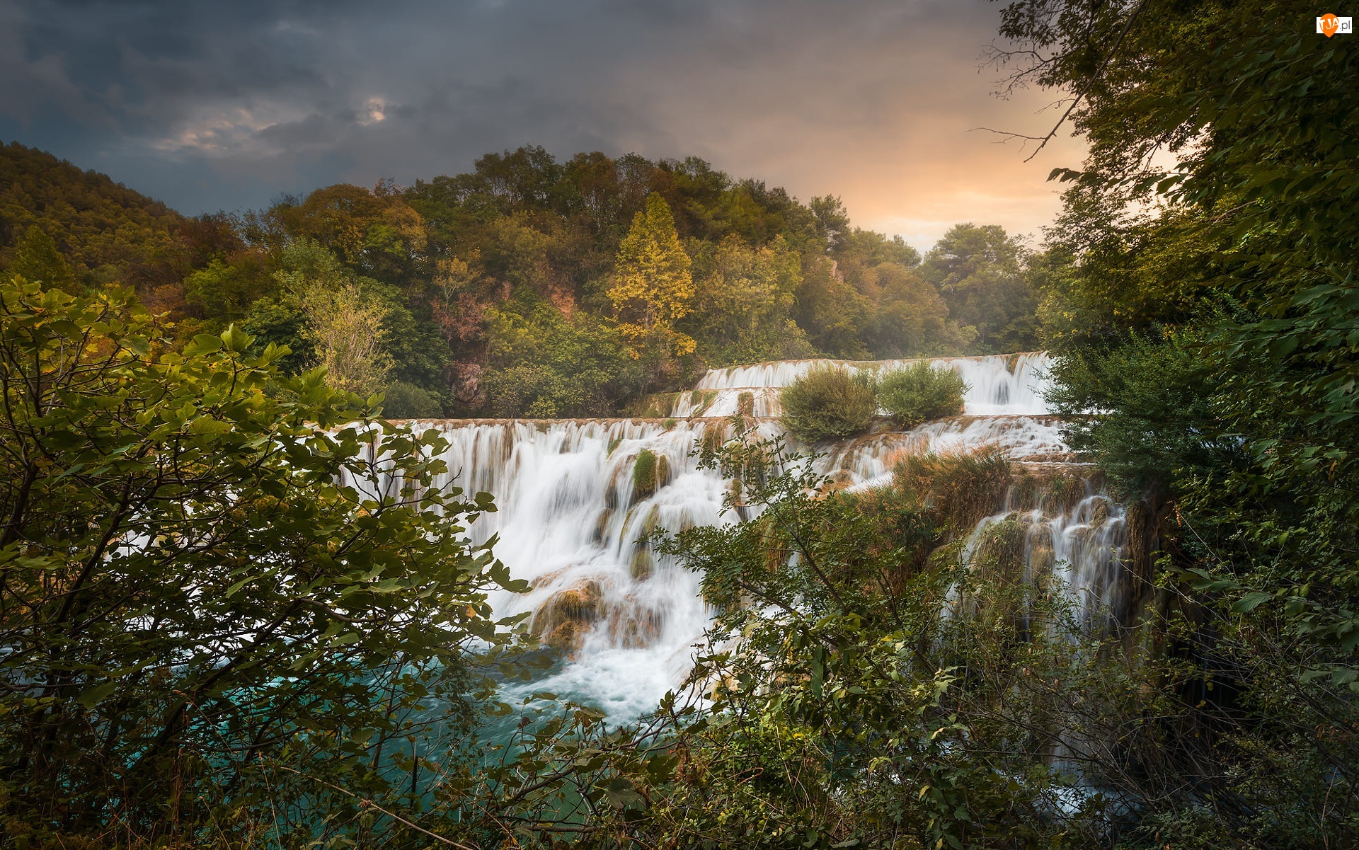 Wodospad, Chorwacja, Krzewy, Drzewa, Park Narodowy Krka