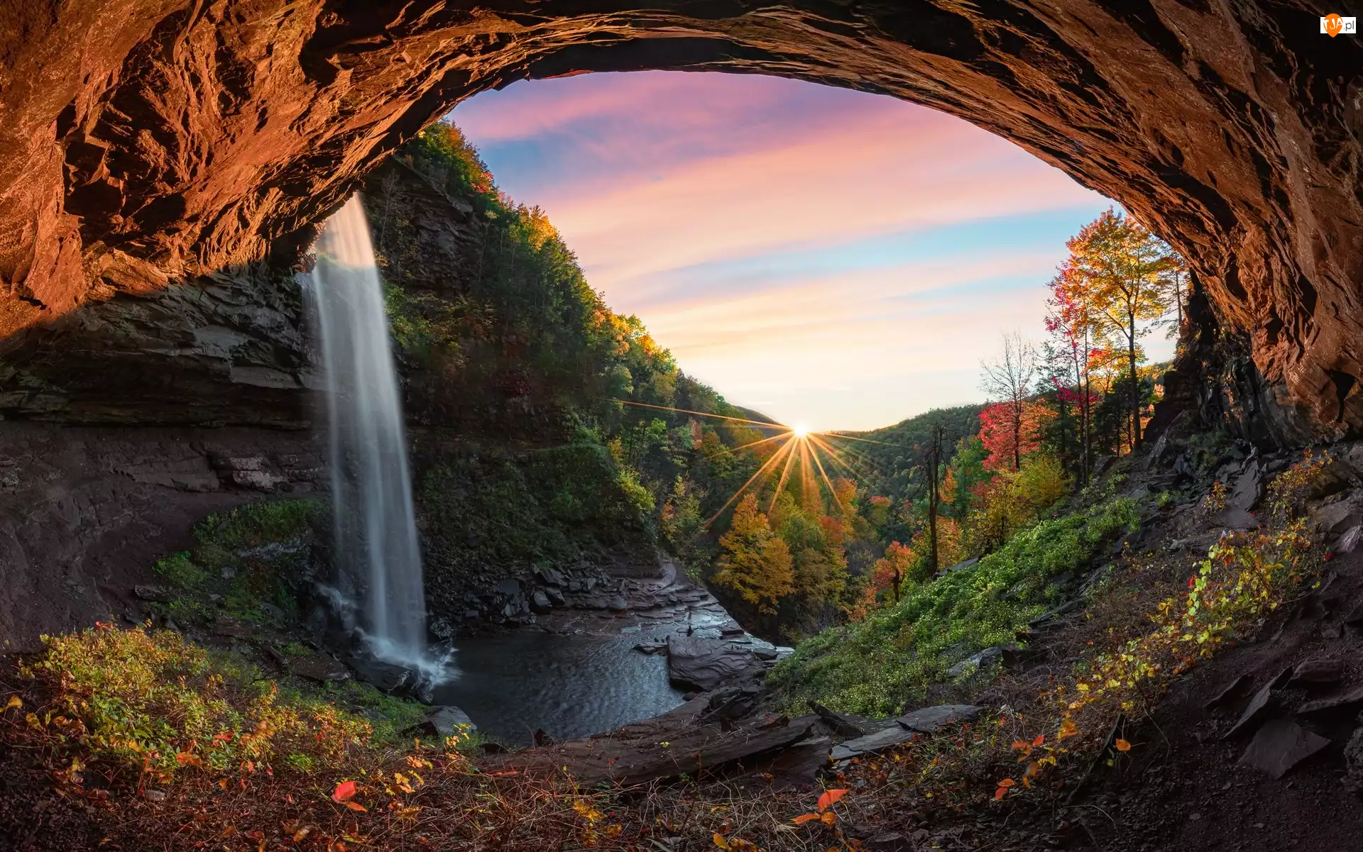 Stany Zjednoczone, Jesień, Promienie słońca, Drzewa, Skała, Jaskinia, Kaaterskill Falls, Wodospad, Las, Stan Nowy Jork