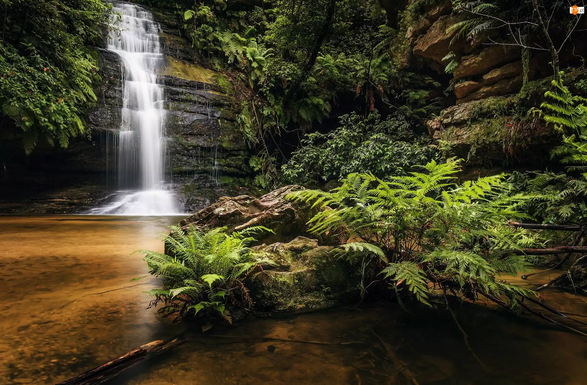 Wodospad, Paprocie, Skały, Rośliny