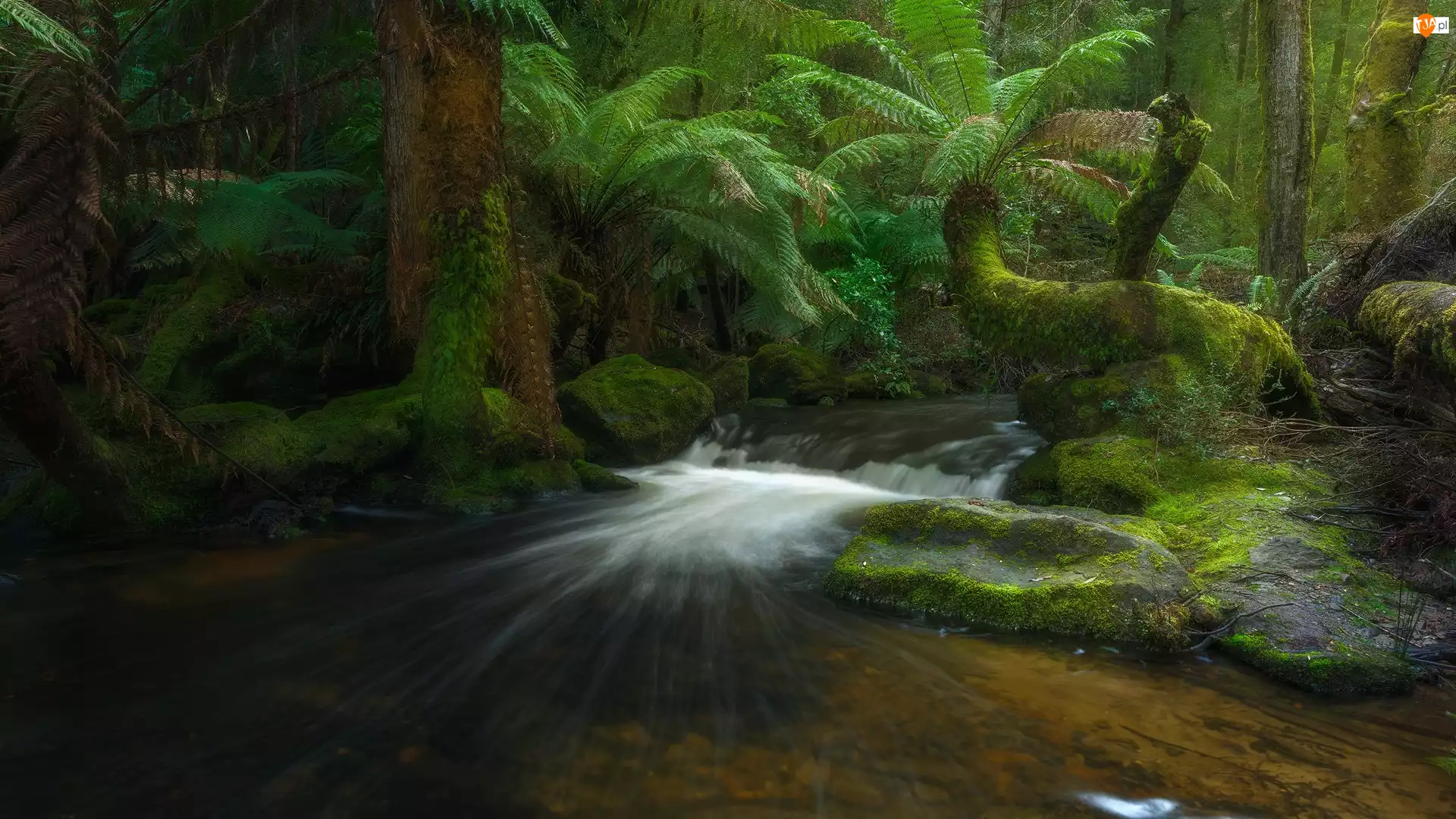 Paprocie, Australia, Las deszczowy, Rzeka, Tasmania, Drzewa, Strumień, Park Narodowy Mount Field