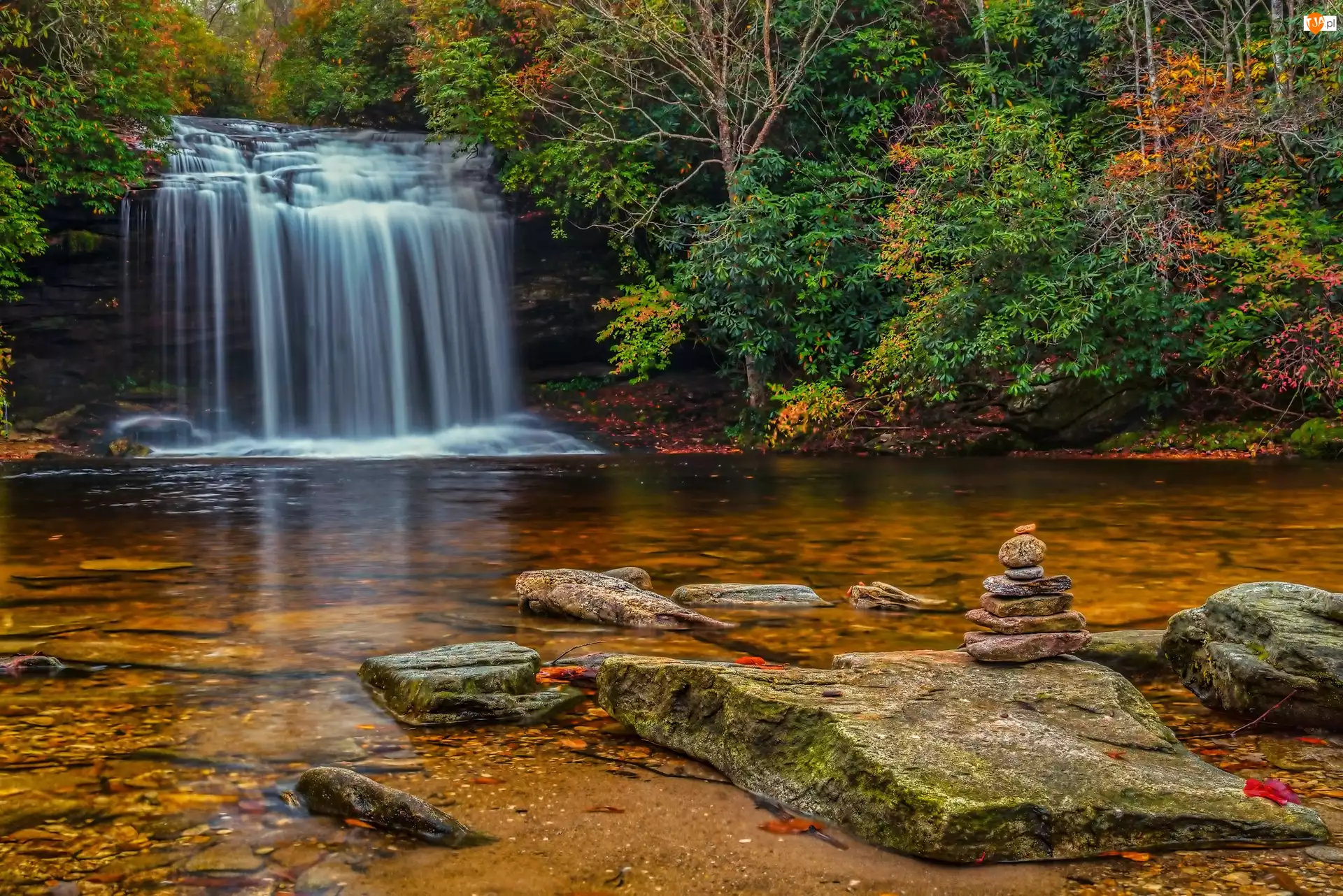 Wodospad, Las, Jesień, Drzewa, Rzeka, Kamienie