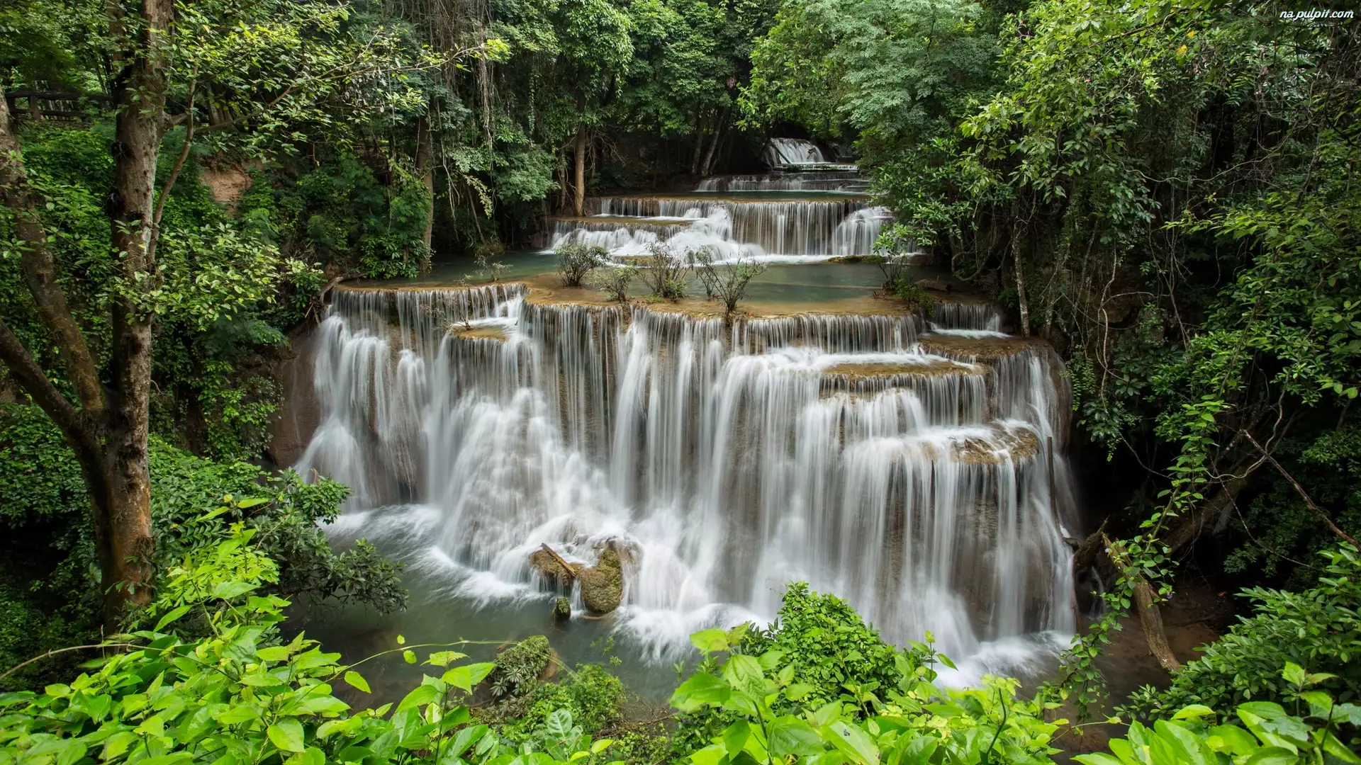 Kaskada, Wodospad Erawan waterfall, Park Narodowy Erawan, Tajlandia, Drzewa, Prowincja Kanchanaburi