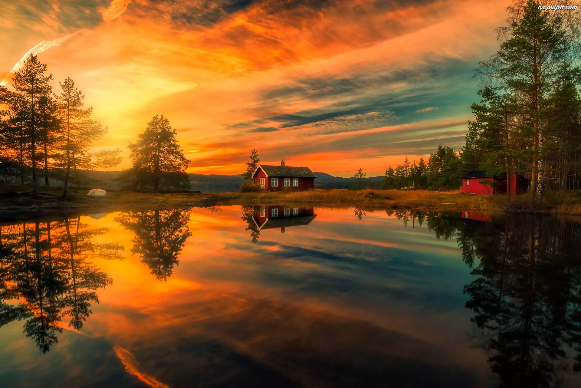 Wschód Słońca, Dom, Ringerike, Odbicie, Norwegia, Jezioro