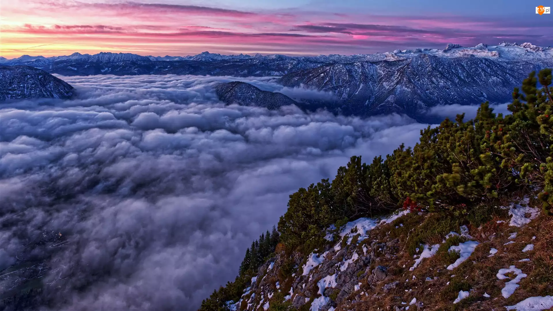 Wschód słońca, Góry, Krzewy, Śnieg, Mgła, Iglaki