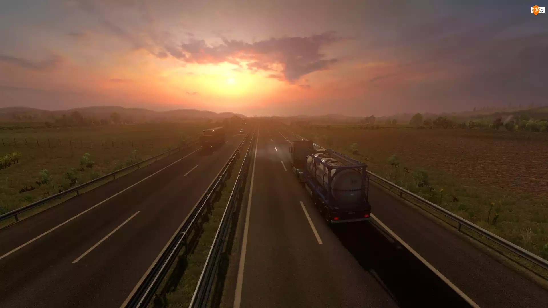 Euro Truck Simulator 2, Gra, Wschód słońca, Ciężarówki, ETS 2, Autostrada