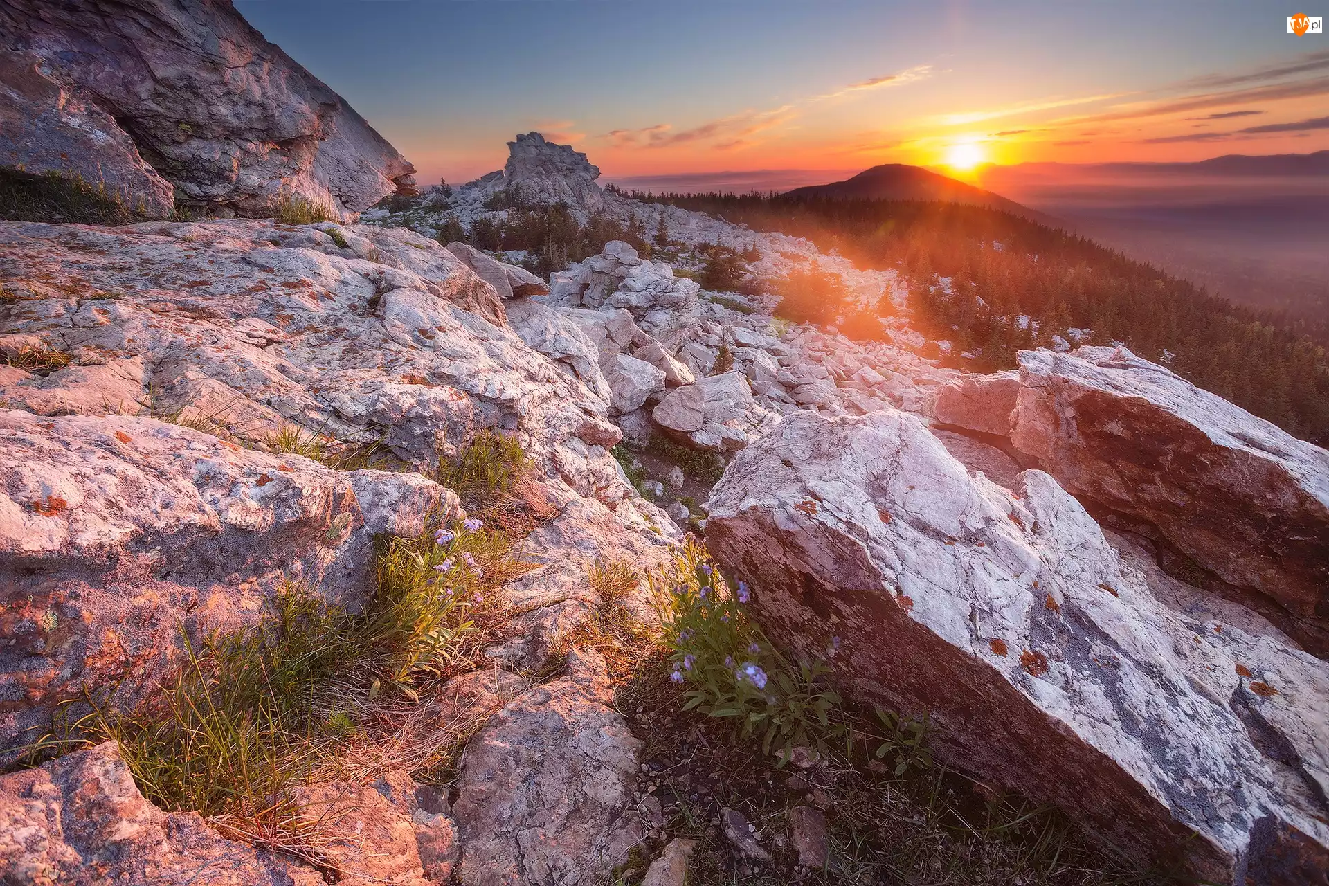 Południowy Ural, Skały, Rosja, Góry Ural, Obwód czelabiński, Park Narodowy Ziuratkul, Wschód słońca
