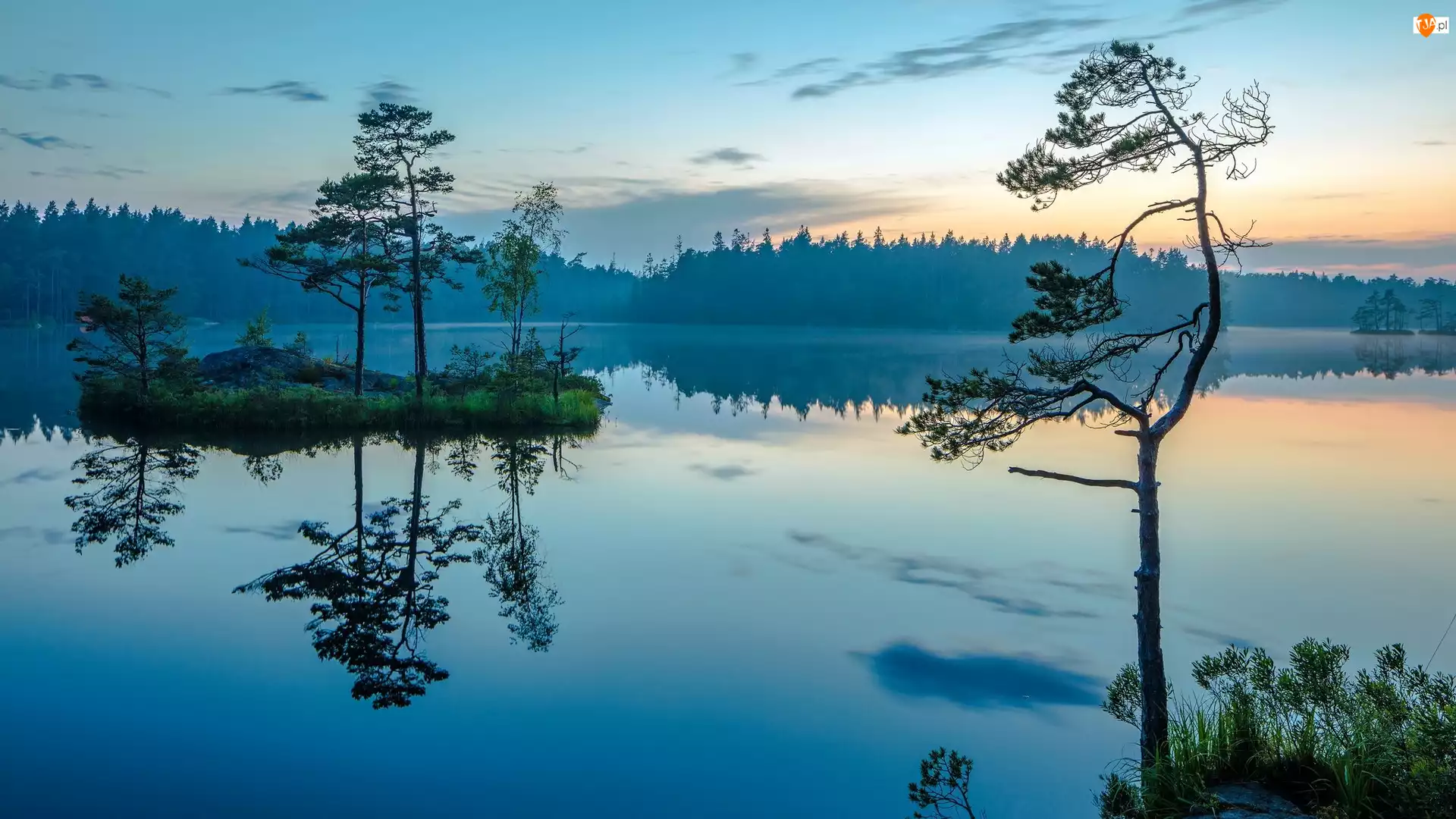 Jezioro, Wschód Słońca, Szwecja, Drzewa, Park Narodowy Tyresta, Wysepka