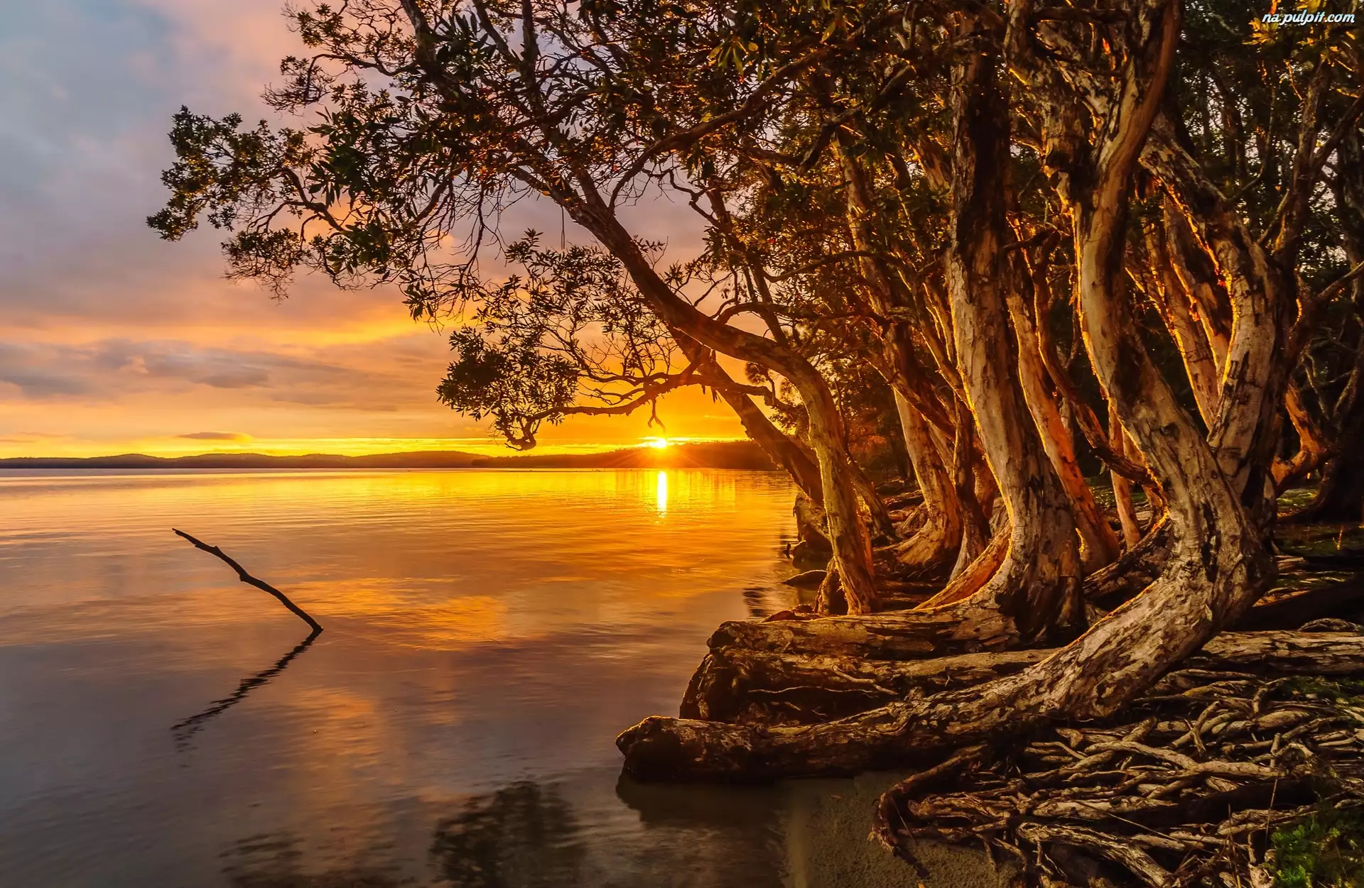 Wschód słońca, Jezioro, Krzywe, Drzewa