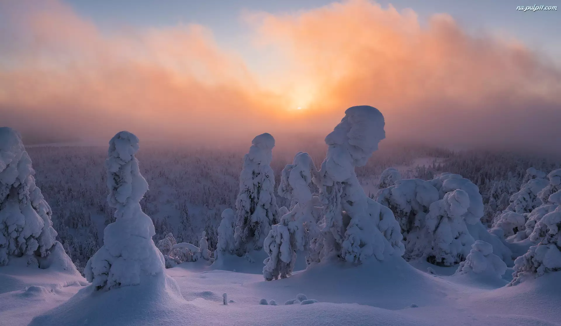 Rezerwat przyrody Valtavaara, Zima, Mgła, Laponia, Zaśnieżone, Wschód słońca, Finlandia, Drzewa