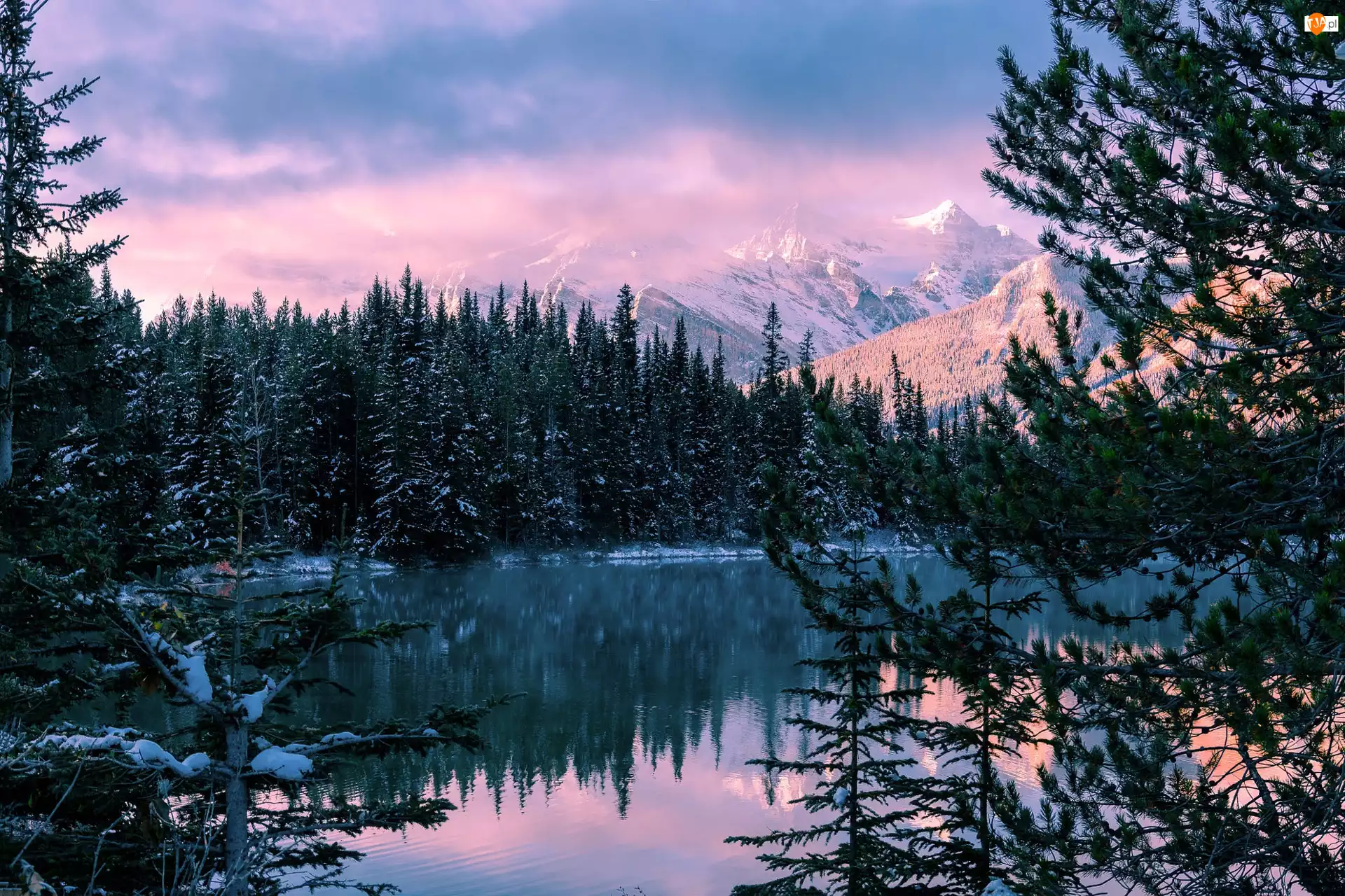 Zima, Śnieg, Poranek, Odbicie, Niebo, Jezioro, Drzewa, Góry, Las
