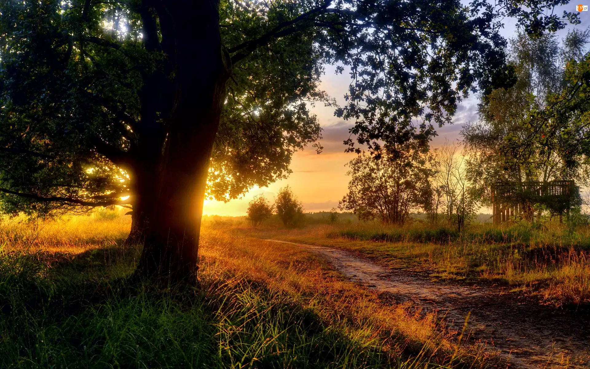 Wschód Słońca, Polna, Drzewo, Droga, Poranek