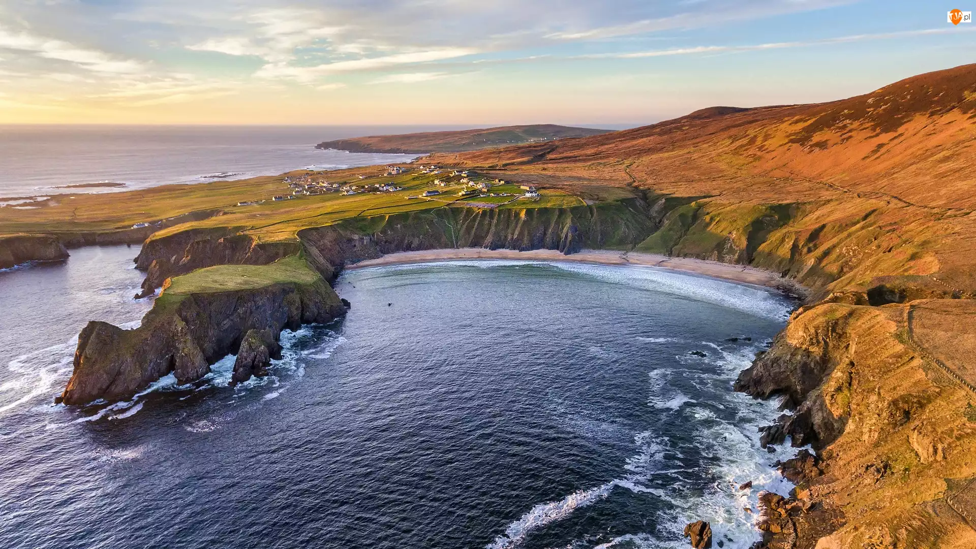 Irlandia, Wybrzeże Glencolmcille, Hrabstwo Donegal, Silver Strand Horseshoe Beach, Malin Beg, Klify, Zatoka, Morze, Plaża