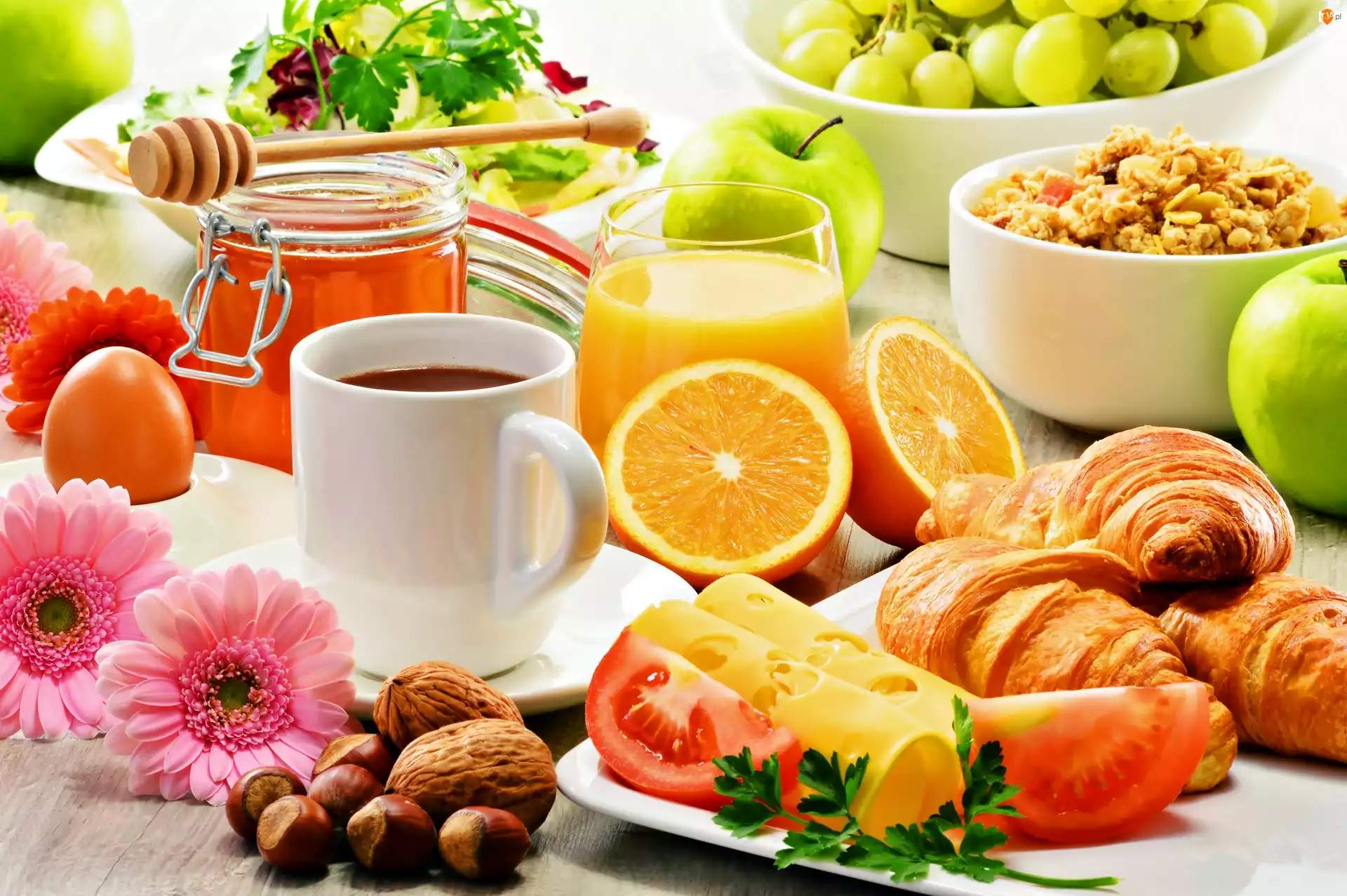 Rogaliki, Śniadanie, Owoce, Sok, Ser, Miód