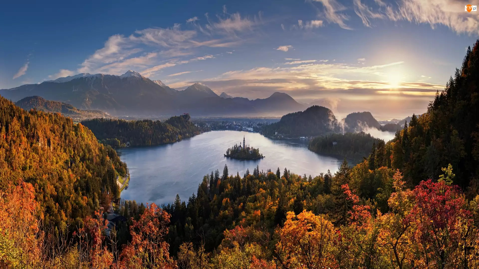 Jesień, Las, Góry Alpy Julijskie, Drzewa, Wyspa Blejski Otok, Chmury, Słowenia, Mgła, Jezioro Bled, Wschód słońca