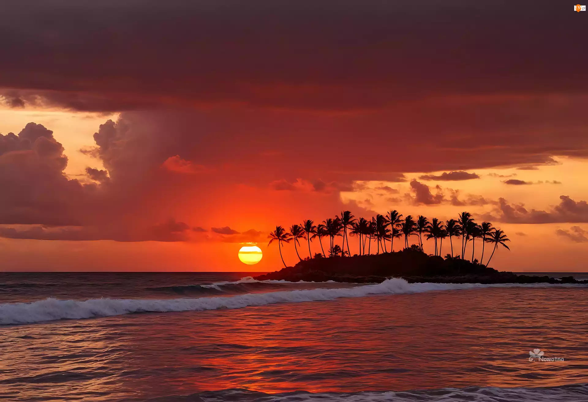 Wyspa, Grafika, Zachód słońca, Morze, Palmy