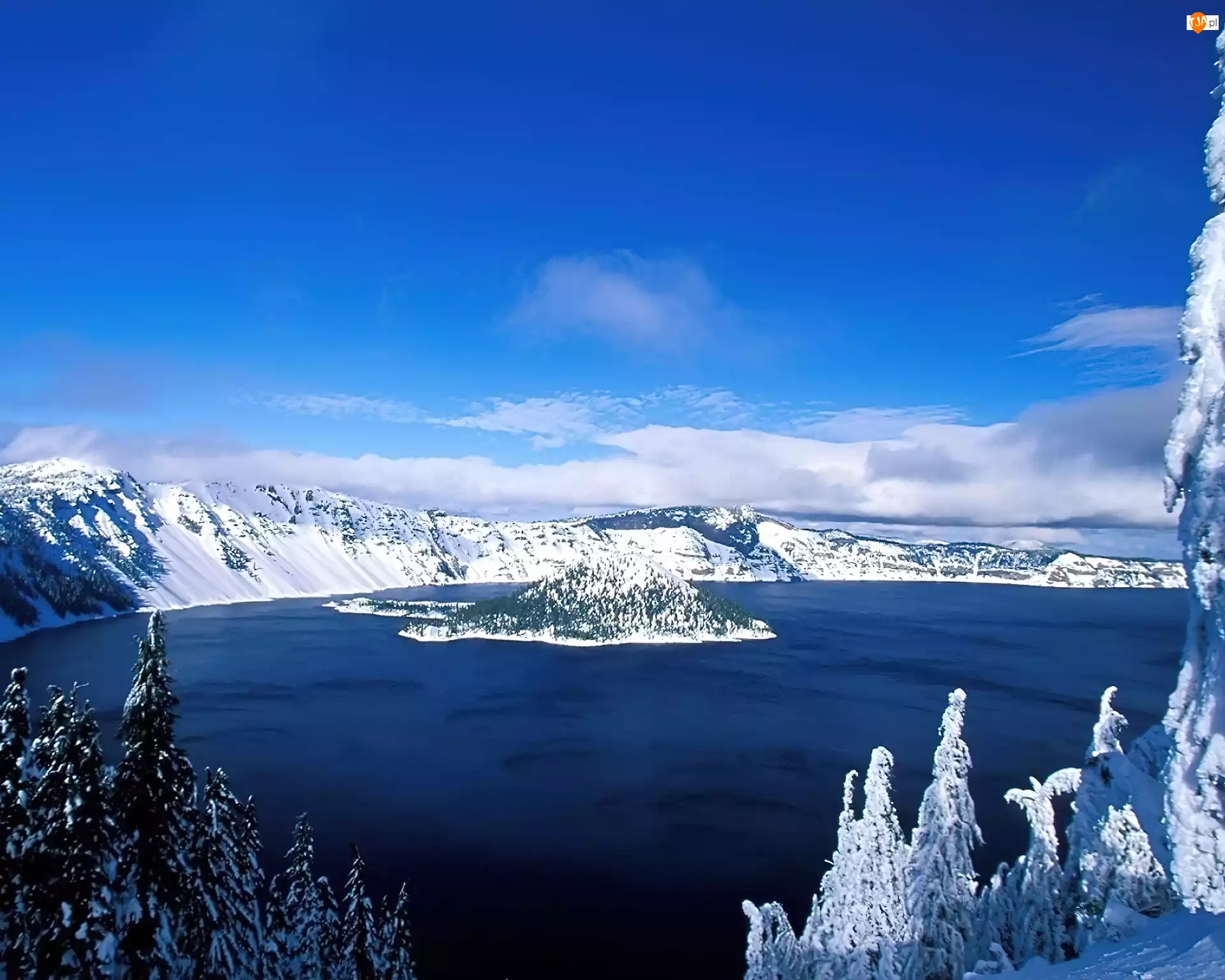 Wyspa, Jezioro, Góry, Las, Śnieg