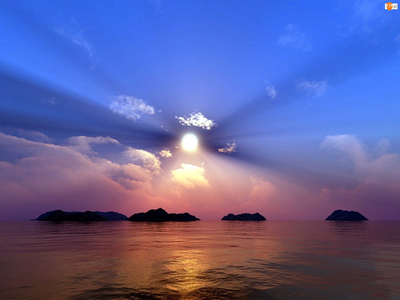 Wyspy, Promienie, Morze, Słońca, Skaliste, Chmur