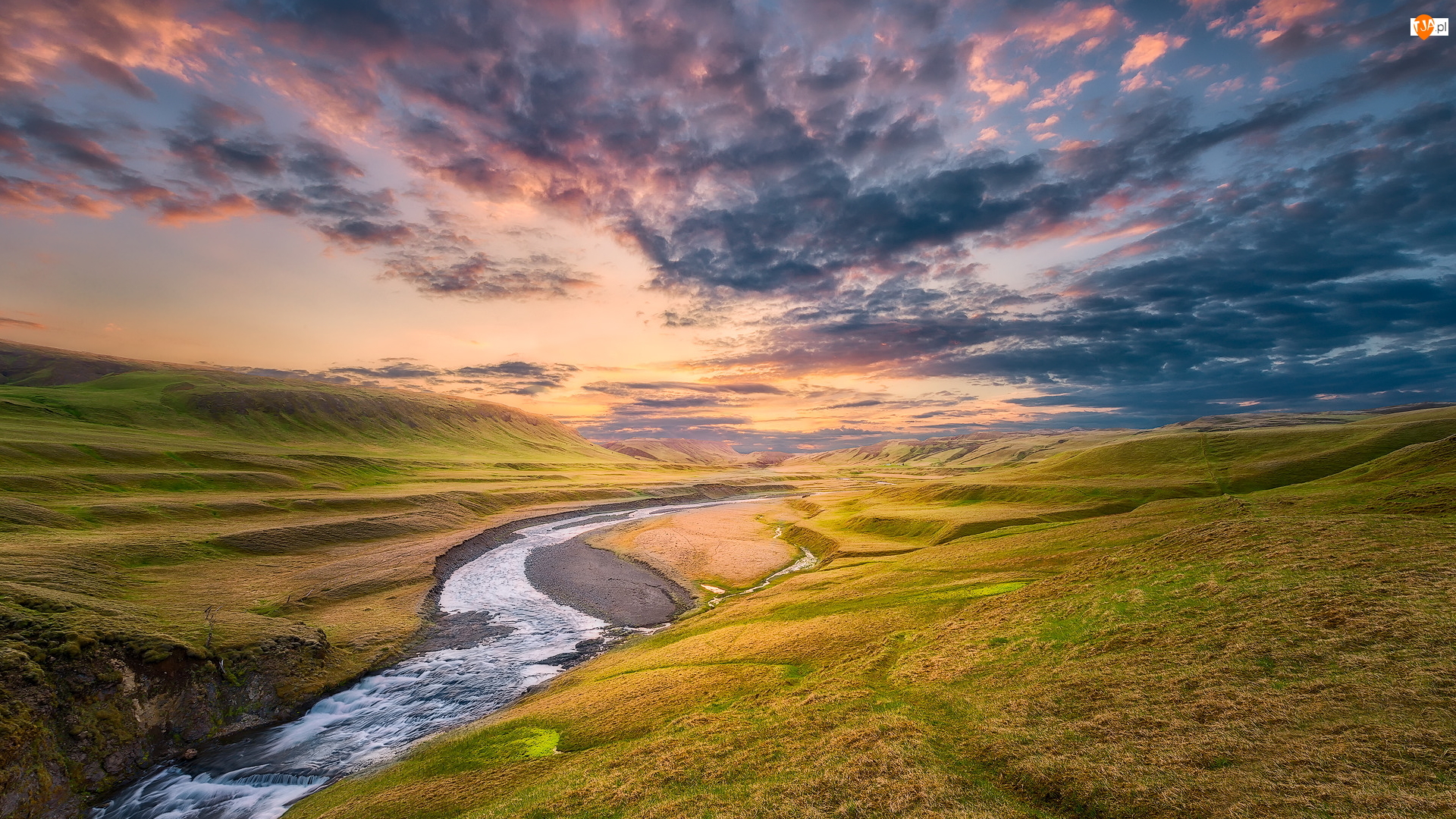 Chmury, Islandia, Rzeka Fjadra, Wzgórza, Zachód słońca