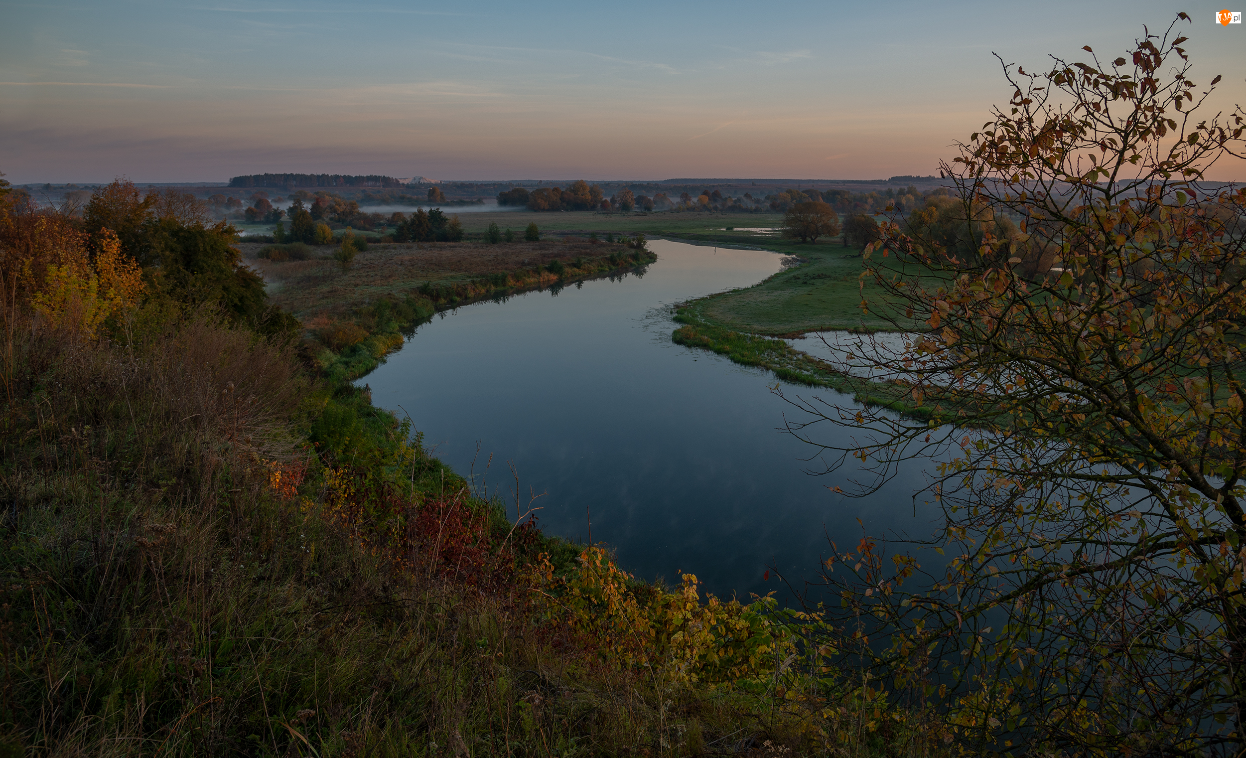 Pola, Wschód słońca, Wzgórza, Rzeka, Drzewa