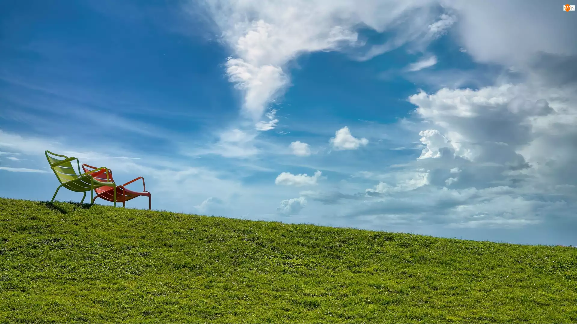 Wzgórze, Chmury, Trawa, Krzesła, Niebo