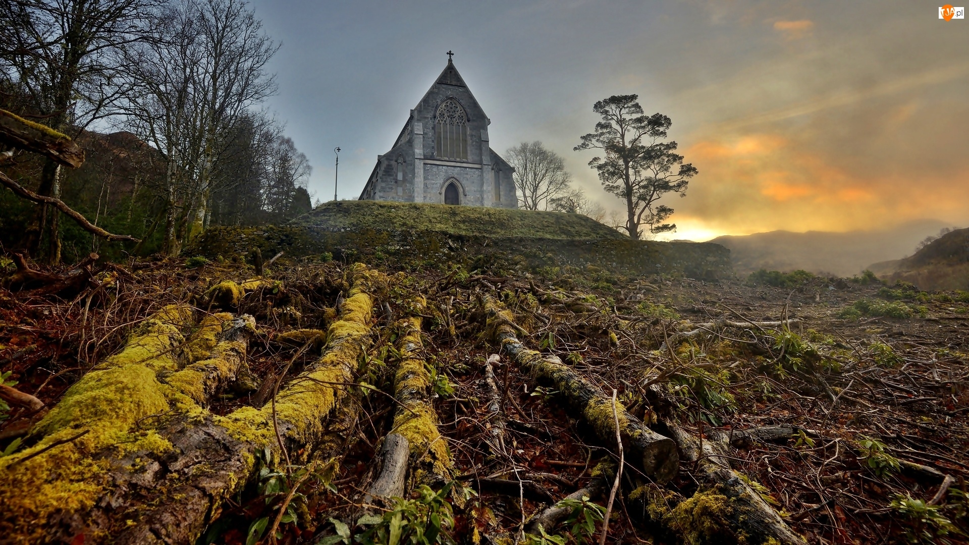 Wzgórze, Drzewa, Kościół, Wschód Słońca