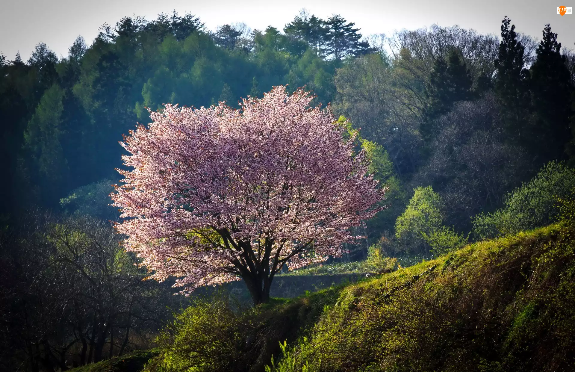 Wzgórze, Pochylone, Drzewo, Kwitnące, Owocowe