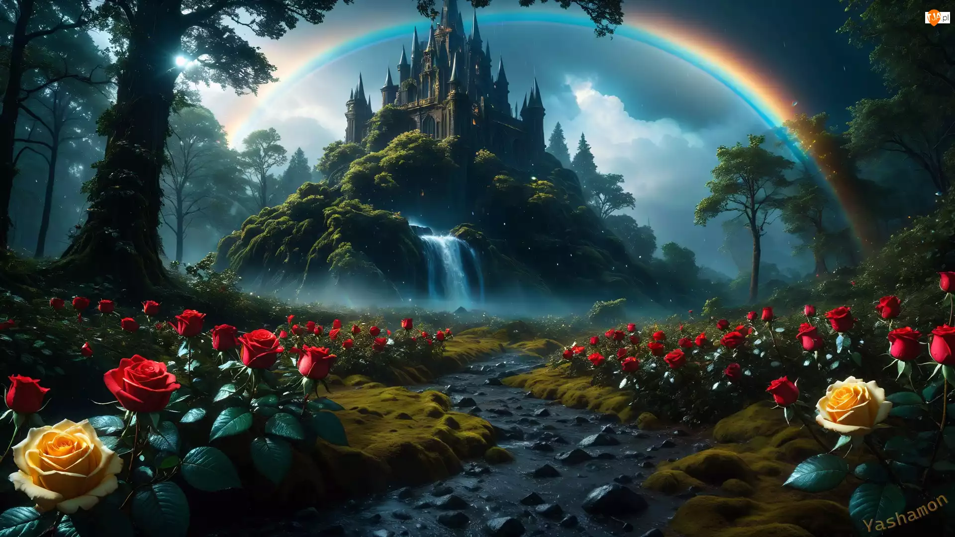 Wzgórze, Zamek, Drzewa, Tęcza, Rzeka, Róże