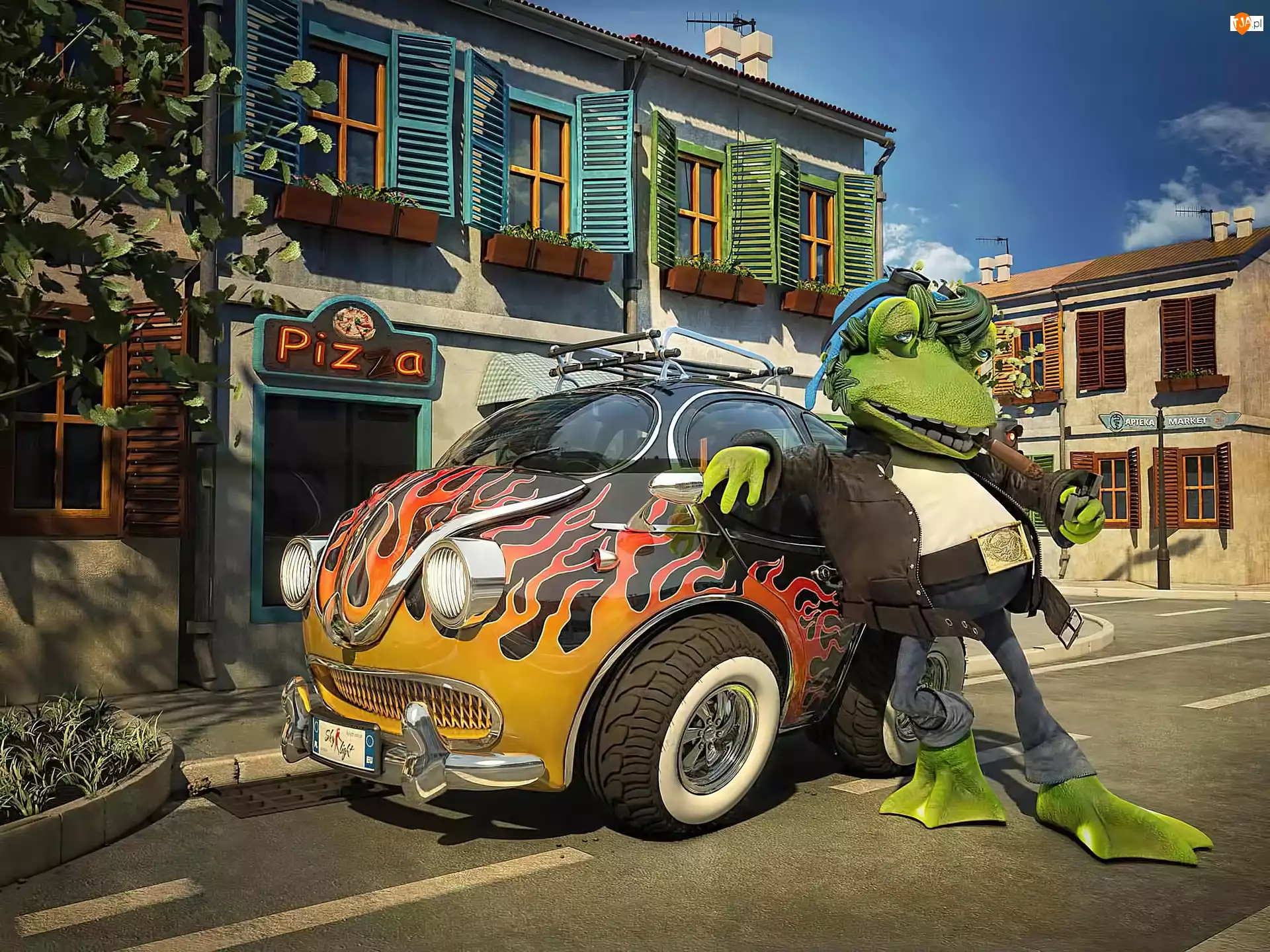 Żaba, Budynki, Samochód, Ulica