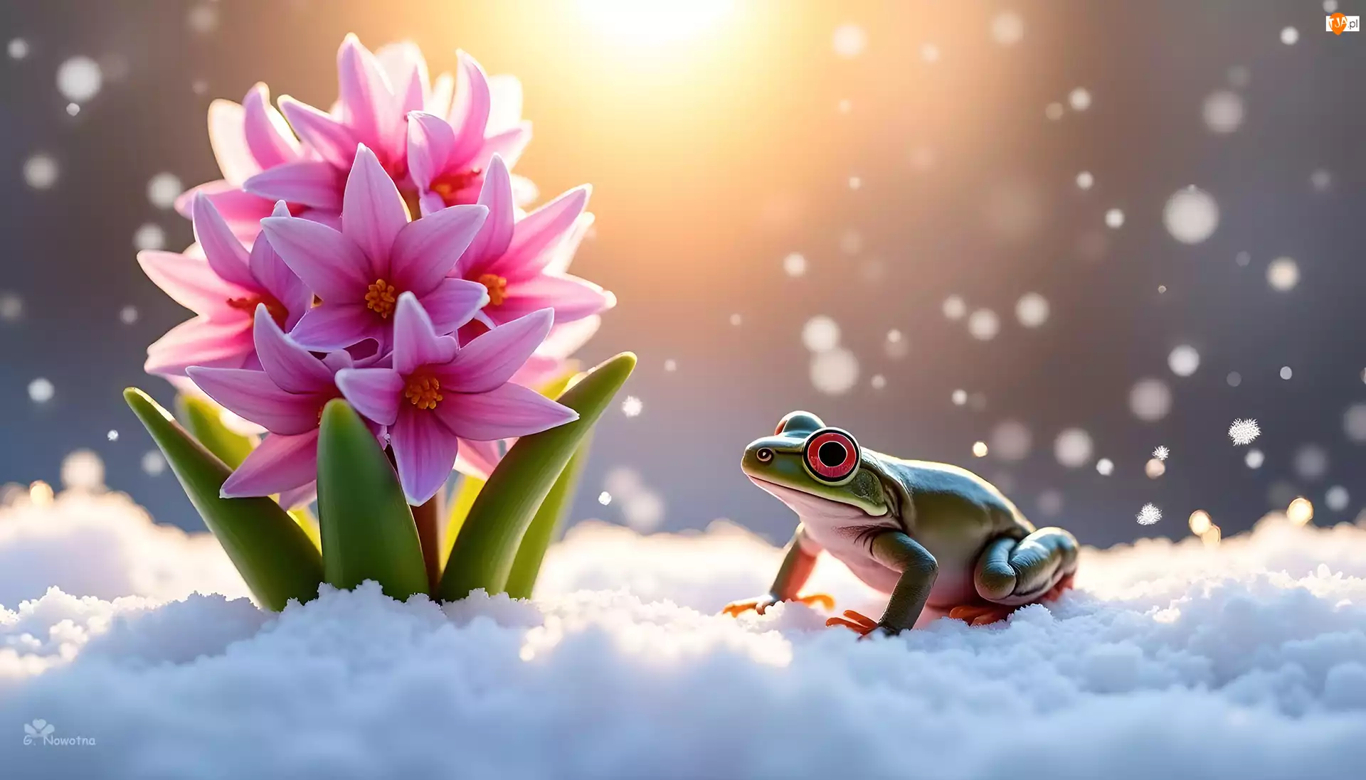 Żaba, Grafika, Hiacynt, Różowy, Śnieg