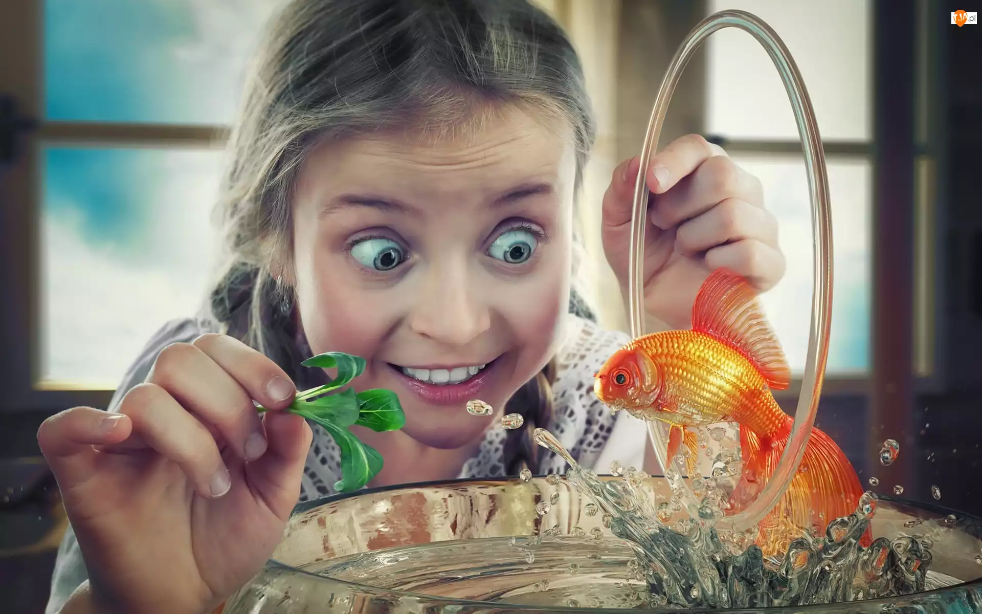 Zabawa, Woda, Rybka, Dziewczynka, Miska