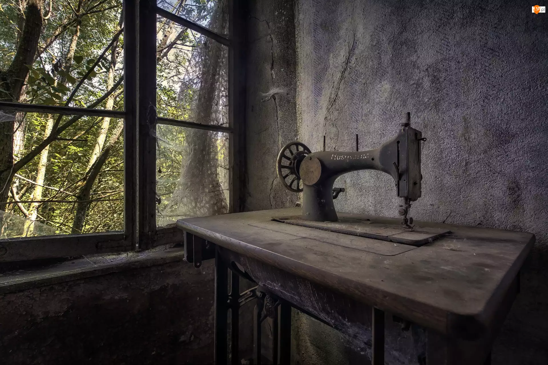 Stara, Zabytkowa, Zaniedbane, Maszyna do szycia, Pajęczyny, Firanka, Okno