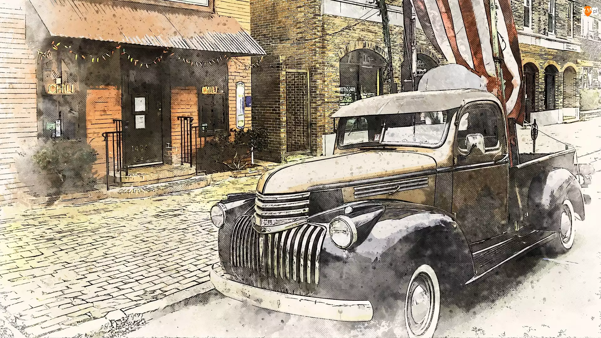 Paintography, Grafika, Zabytkowy, Domy, Ulica, Samochód